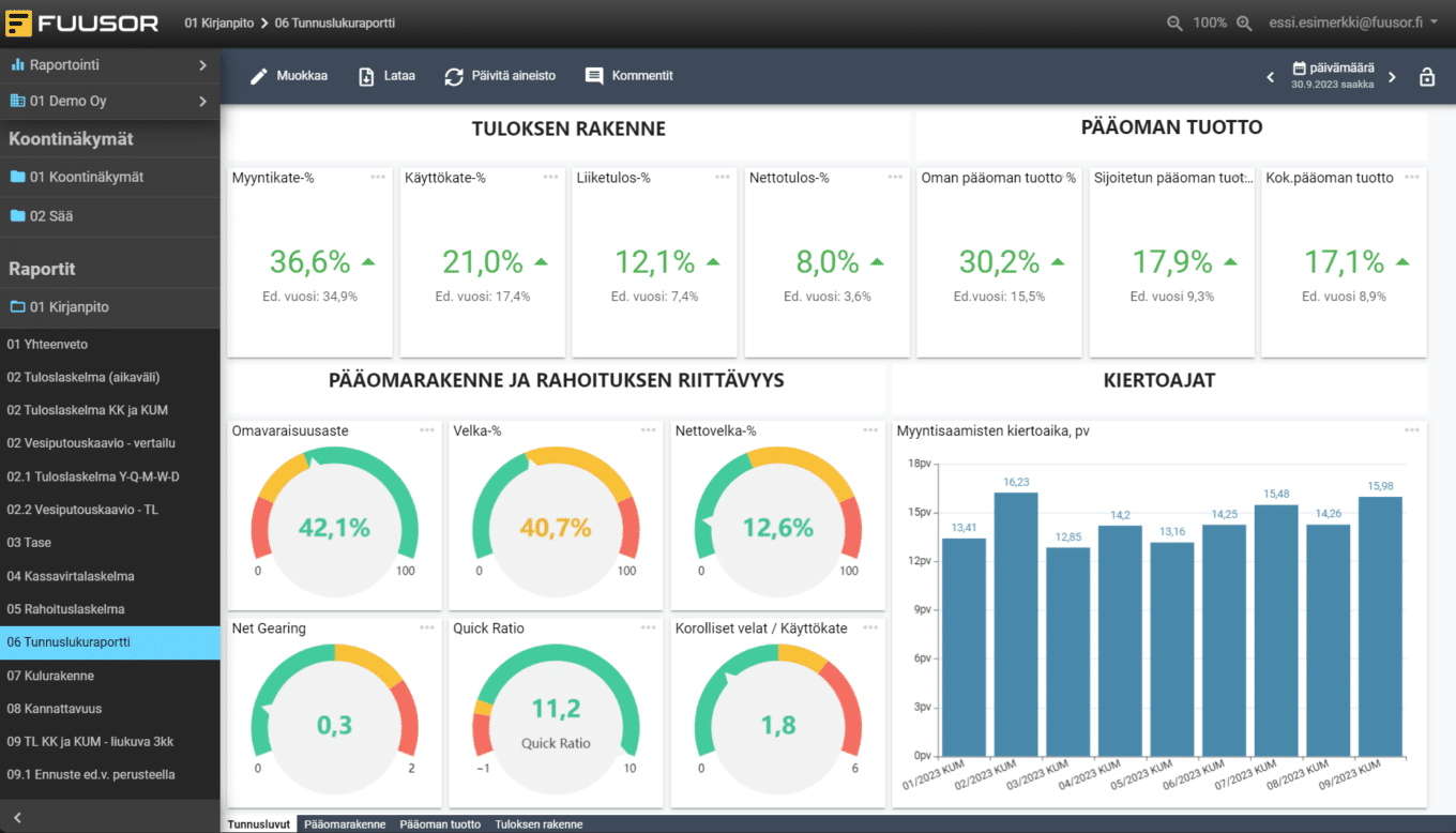 Fuusor BI on helppokäyttöinen ja joustava raportointityökalu liiketoiminnan raportoinnin ja analysoinnin kehittämiseen ja automatisointiin. Palvelu sisältää paljon valmiita raportoinnin työkaluja ja toimintoja sekä valmiit raporttipaketit, jotka voidaan ottaa heti käyttöön. Fuusoriin voidaan tuoda kaikki sinua kiinnostava liiketoimintatieto. Eri lähteistä kerättyä dataa voidaan yhdistellä kätevästi.